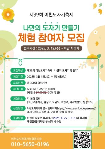 사전 체험은 3월 15일부터 4월 10일까지 진행되며, 매일 오전 10시, 오후 2시에 두 차례 운영된다. 체험비는 기존 가격보다 50% 할인되어 부담 없이 참여할 수 있도록 했다. 사전 체험 프로그램에 참여를 원하는 사람들은 이천도자기축제 공식 누리집에서 큐알(QR) 코드를 스캔하여 신청할 수 있다. 신청은 2025년 3월 12일부터 선착순으로 할 수 있고 조기 종료될 수 있으므로 미리 서두르는 게 좋다.