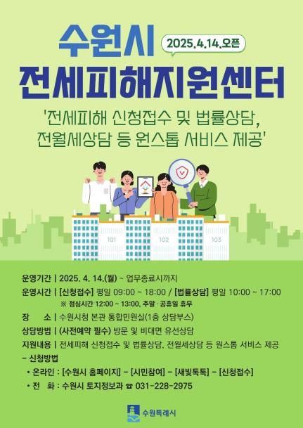 (비전21뉴스=정서영 기자) 수원시는 전세사기 피해자 지원을 강화하기 위해 수원시청 본관 1층 통합민원실 내에 ‘수원시 전세피해지원센터’를 정식 운영한다.
