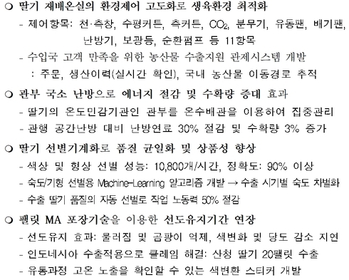 이와 함께 수출 농가에서 요구해 온 '생육 환경 제어', '겨울철 난방비 절감', '딸기 선별의 기계화', '수출 중 딸기 물러짐과 곰팡이 발생 감소' 등 네 가지 문제점 해결을 위한 연구를 진행했다.