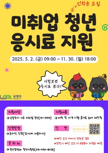 신청일 기준 남양주시에 주민등록을 두고 있는 만 19세~39세 미취업 청년이 대상이며, 신청 기간은 5월 2일부터 예산 소진 시까지다.