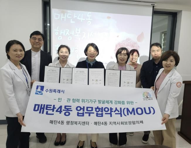 민상희 매탄4동장은 “이번 협약은 매탄4동이 더 따뜻하고 촘촘한 복지 공동체로 나아가는 계기라고 생각한다. 건강복지 울타리 조성에 협력하고자 손을 내밀어주신 S서울병원과 매탄4동 지역사회보장협의체에 감사드린다. 관내 단체와 함께 촘촘한 건강복지 울타리 조성에 최선을 다하겠다.”고 밝혔다.