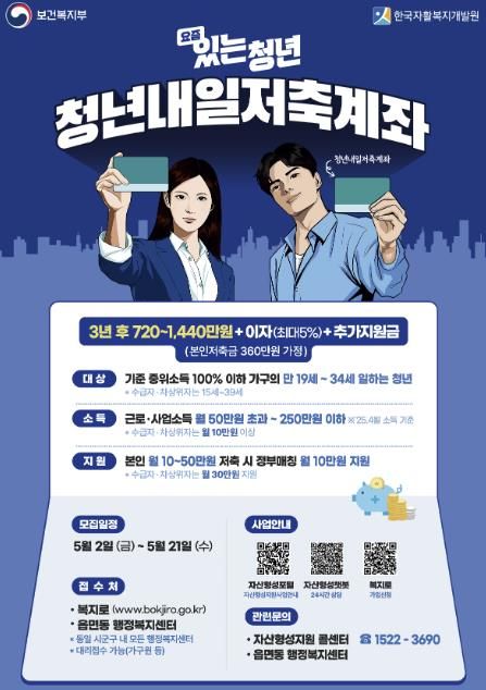 자산형성지원사업의 일환인 청년내일저축계좌 사업은 통장 가입 기간 3년 동안 가입자가 근로활동을 통해 매월 10만 원 이상 저축하면 매달 정부지원금 10만 원에서 30만 원을 추가로 적립해 만기에 돌려주는 사업이다.