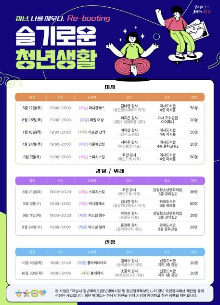 (비전21뉴스) 하남시는 청년들의 문화적 수요에 부응하고, 건강한 여가 활동과 자기돌봄의 기회를 제공하기 위해 오는 6월부터 10월까지 청년 맞춤형 원데이 문화 특강 ‘슬기로운 청년생활’을 운영한다고 밝혔다.