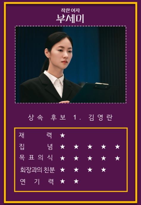 극 중 김영란(전여빈 분)이 가성그룹 회장 가성호(문성근 분)와 계약 결혼을 하면서 가성호의 유산 상속인 리스트에 의붓자녀(子女) 가선영(장윤주 분), 가선우(이창민 분)를 비롯해 김영란까지 올라가게 되는 상황.