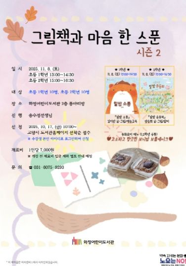 (비전21뉴스) 고양특례시 화정어린이도서관은 오는 11월 8일 ‘고소하고 향긋한 보늬밤 보틀케이크’를 만들어보는 그림책 동화요리 프로그램‘그림책과 마음 한 스푼-시즌2’를 운영한다.