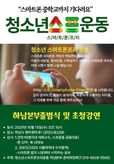 (비전21뉴스) 15일 오전 10시, 하남시 벤처센터에서 ‘청소년 스마트폰 프리 운동(Smartphone-Free)’ 하남본부 출범식을 갖는다.