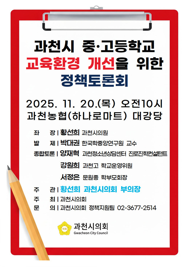 (비전21뉴스=정서영 기자) 과천시의회는 오는 11월 20일(목) 오전 10시, 과천농협 대강당에서‘과천시 중·고등학교 교육구조 개선 정책토론회’를 개최한다고 밝혔다.