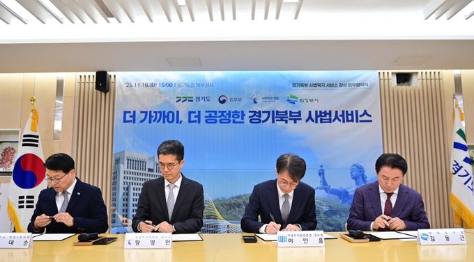 김대순 경기도 행정2부지사와 황병헌 의정부지방법원 법원장, 이만흠 의정부지방검찰청 검사장, 김동근 의정부시장은 18일 경기도 북부청사에서 이런 내용을 담은 ‘경기북부 사법복지 서비스 향상 업무협약’에 서명했다.