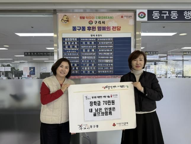 (비전21뉴스) 구리시 동구동 행정복지센터는 지난 18일 동구동 행정복지센터 대회의실에서 '내 남은 인생은 골프와 함께' 모임으로부터 관내 취약계층 청소년을 위한 장학금 70만 원을 기탁받았다고 밝혔다.