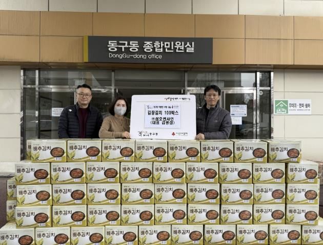 이날 전달식에는 ㈜삼호썬샤인 관계자와 동구동장이 참석해 따뜻한 나눔의 의미를 함께했다. 전달된 김장 김치는 관내 취약계층 100가구에 골고루 전달될 예정이다.