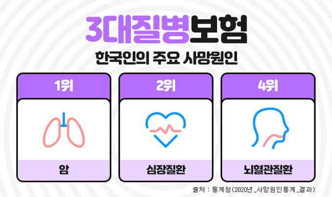 (비전21뉴스) 한국인의 주요 사망원인중에 암, 뇌혈관질환, 심혈관질환은 흔히 3대질병이라 일컬어지며 살아가면서 가장 먼저 대비해야 하는 중대질병으로 항상 강조되고 있다. 이들 질병에 미리 대비하기 위해 가입하는 것이 진단비보험인데, 이러한 3대질병진단비를 중점으로 보장하는 보장성보험이 3대진단비보험 이다. 3대질병진단비보험은 각각의 질병에 주목해서 보장하기도 하지만, 나에게 맞는 추가 특약을 잘 골라서 가입한다면 종합건강보험으로도 충분히 활용도가 높다.
