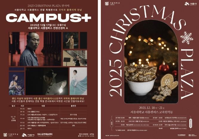(비전21뉴스) 시흥시와 서울대학교 시흥캠퍼스가 오는 12월 17일부터 21일까지 특별 행사인 ‘2025 크리스마스 플라자(CHRISTMAS PLAZA)’를 개최한다. 올해 행사는 단 하루만 열리는 전야제 특별콘서트 ‘캠퍼스 플러스’를 중심으로, 국악과 클래식을 대표하는 최정상급 연주자들이 한자리에 모여 연말 분위기를 고조시킬 예정이다.