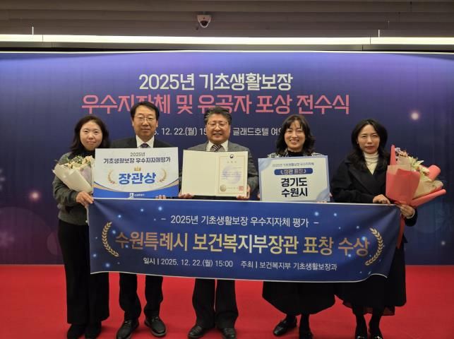 (비전21뉴스) 수원특례시가 보건복지부 주관 ‘2025년 기초생활보장·긴급지원 사업’ 평가에서 우수 지자체로 선정돼 보건복지부 장관 표창을 받았다. 시상식은 22일 서울 글래드호텔에서 열렸다.