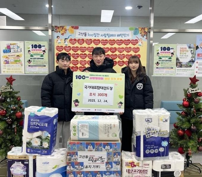 (비전21뉴스) 의정부시 고산동주민센터는 12월 24일 고산동 소재 국가대표 탑 태권도장이 지역 저소득층을 위해 두루마리 화장지 300개를 기부했다고 밝혔다.