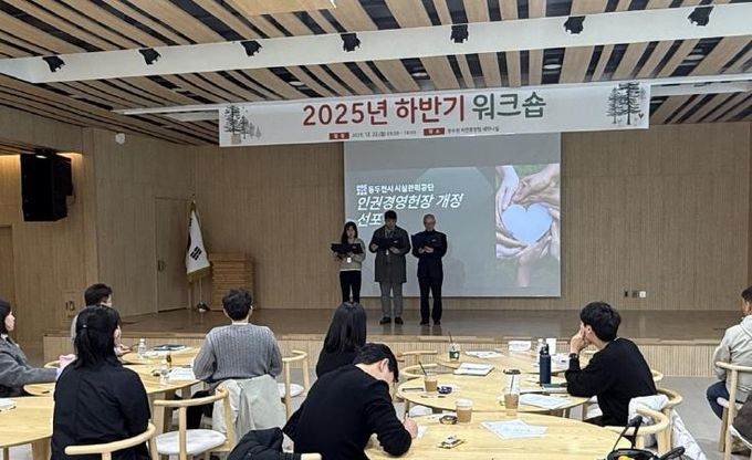 (비전21뉴스) 동두천시 시설관리공단은 지난 22일 동두천 자연휴양림 세미나실에서 열린 2025년 하반기 워크숍에서 인권경영 헌장 개정 및 선포식을 개최했다고 밝혔다.