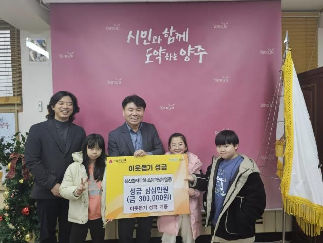 (비전21뉴스) 양주시 남면 신산감리교회 초등부 4학년반 학생들은 지난 23일 남면 행정복지센터를 방문해 이웃돕기 성금을 전달하며 이웃사랑 실천에 앞장섰다.