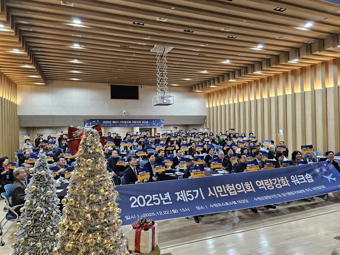 이번 워크숍은 ▲유공 시민 포상 및 신규 임원 위촉 ▲전문가 강연 ▲2025년 활동 성과 및 2026년 사업계획 보고 ▲활동 방향 분과별 토론 ▲수원 군공항 이전 결의 퍼포먼스 순으로 진행됐다.