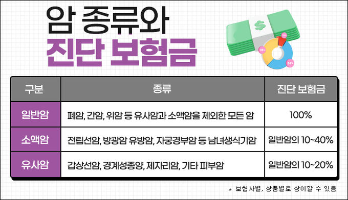 일반적으로 보험사에서 암을 구분할 때에는 일반암, 유사암, 소액암, 고액암 등으로 분류를 하고 있다. 유사암은 보통 경계성종양, 제자리암, 갑상선암, 기타피부암이 해당되고 소액암은 유방암, 방광암, 전립선암, 자궁암이 해당된다. 그리고 고액암은 뼈암이나 뇌암, 췌장암 등이 해당되며 이들을 제외한 나머지 암을 일반암으로 분류한다. 보통 치료비가 많이 드는 고액암이 다른 암보다 진단금이 높은 편이지만, 폭넓은 보장을 위해서는 일반암 진단비를 늘리는 것이 유리하다. 또한, 유사암이나 소액암은 비교적 치료가 간단하고 비용도 적게 들지만 발생빈도가 높은 관계로 보통 일반암 진단비의 10%~20% 정도만 지급되므로 사전에 보장금액을 살펴볼 필요가 있다.