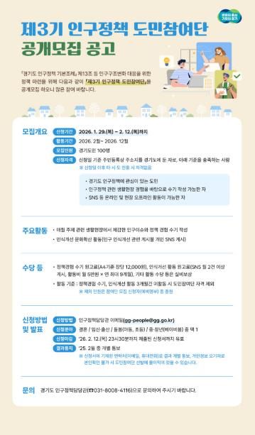 (비전21뉴스=정서영 기자) 경기도가 정책 대상자가 직접 정책개선에 참여하는 ‘제3기 인구정책 도민참여단’ 100명을 공개 모집한다.