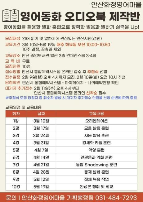(비전21뉴스) 안산시가 설립하고 안산대학교가 운영하는 안산화정영어마을이 성인 영어 학습자를 위한 ‘영어동화 오디오북 제작반’을 3월부터 5월까지 10주 과정으로 안산시 중앙도서관에서 운영한다고 4일 밝혔다.