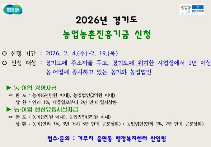 (비전21뉴스) 이천시는 농업인에게 장기·저리 융자 지원을 실시하고 경영안정을 돕기 위해 2026년 경기도 농업농촌진흥기금 농어업 경영자금, 농어업 생산유통시설자금 사업에 대한 신청을 2월 3일부터 접수한다.