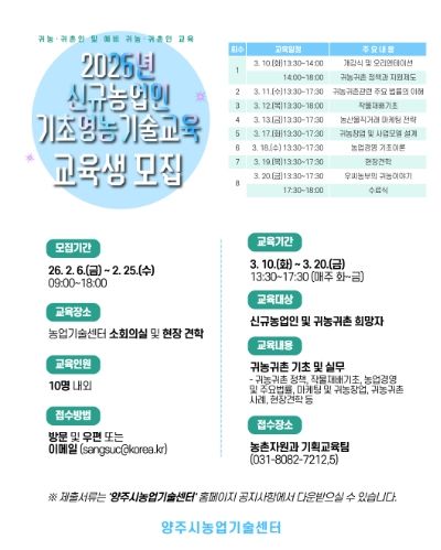 (비전21뉴스) 양주시는 농촌지역으로 이주한 귀농․귀촌인과 예비 귀농인의 안정적인 농촌 정착을 지원하기 위해 ‘2026년 신규농업인 기초영농기술교육’ 교육생을 모집한다.