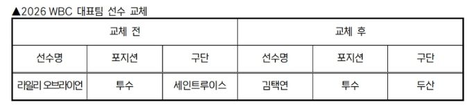 (비전21뉴스) KBO 전력강화위원회는 부상으로 인해 WBC 참가가 어려워진 세인트루이스 라일리 오브라이언을 대체할 선수로 두산 김택연을 확정하고 WBC 조직위에 선수 교체 승인을 요청했다.