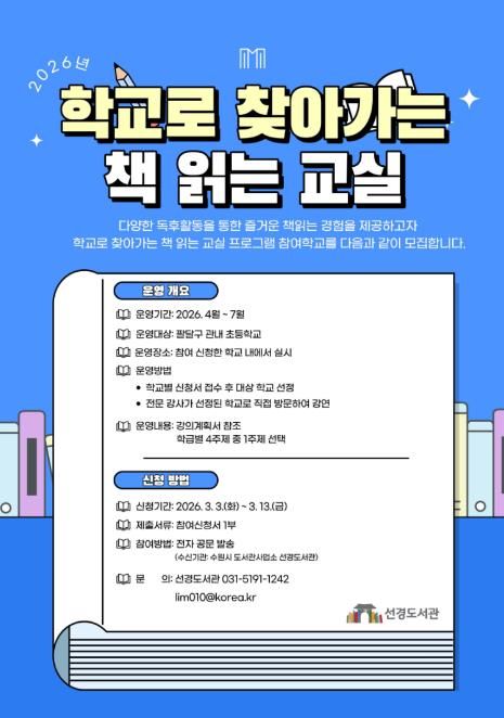 (비전21뉴스) 수원시 선경도서관은 ‘2026년 학교로 찾아가는 책 읽는 교실’에 참여할 팔달구 관내 초등학교를 13일까지 모집한다.