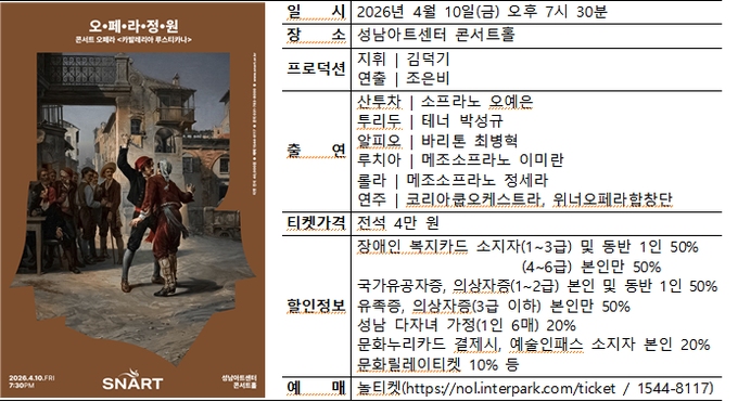 (비전21뉴스=정서영 기자) 성남문화재단(대표이사 윤정국)은 오페라를 쉽고 친근하게 즐길 수 있는 콘서트 오페라 시리즈 ‘2026 오페라정원’의 첫 번째 작품 ‘카발레리아 루스티카나’를 오는 4월 10일(금) 성남아트센터 콘서트홀에서 공연한다.