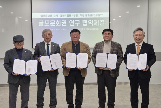 (비전21뉴스) 부천문화원과 강서문화원, 계양문화원, 김포문화원, 부평문화원은 3월 4일 부천문화원에서 ‘굴포문화권’을 토대로 하는 연구교류 협약식을 체결했다. 이로써 ‘굴포’를 같은 문화권으로 하는 부천문화원·강서문화원·계양문화원·김포문화원·부평문화원은 학술대회와 콘텐츠 발굴 사업 등 다양한 지역학 자원을 발굴하고 활성화하기 위해 최초로 지역학 연구 모델을 구축하게 됐다. 특히, 이번 협약은 경기도(부천, 김포), 서울특별시(강서), 인천광역시(계양, 부평)를 잇는 ‘지역학’ 중심의 연구 교류를 마련한다는 점에서 주목된다.
