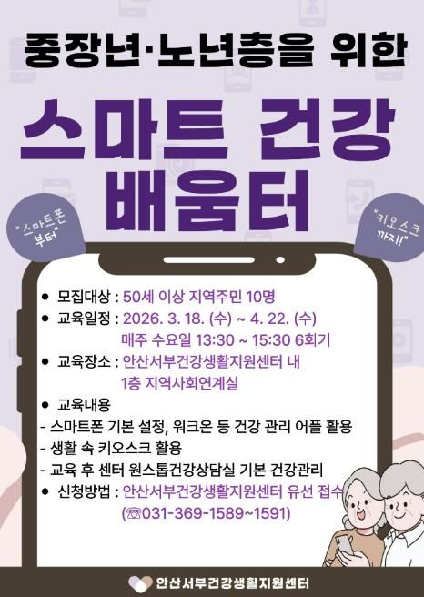 (비전21뉴스) 안산시는 단원보건소 서부건강생활지원센터는 오는 18일부터 ‘중장년‧노년층을 위한 스마트 건강 배움터’를 운영한다고 6일 밝혔다.