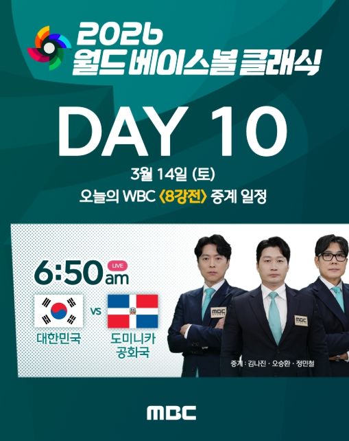한편, MBC는 내일(14일) 토요일 오전 6시 50분부터 미국 마이애미 론디포파크에서 펼쳐지는 2026 WBC 8강전 대한민국과 도미니카 공화국의 경기를 오승환, 정민철 해설위원과 김나진 캐스터의 진행으로 마이애미 현지에서 생중계한다.