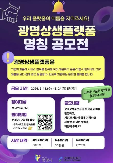 시는 오는 18일부터 24일까지 지역 중소기업 온라인 홍보관인 ‘광명상생플랫폼’의 새로운 명칭을 찾기 위해 명칭 공모전을 개최한다.