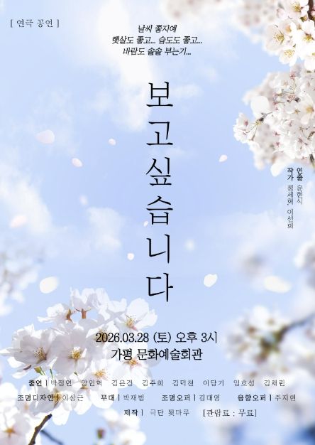 군은 오는 28일 오후 3시 가평문화예술회관에서 연극 전문 극단 툇마루의 대표작 ‘보고싶습니다’를 무료로 상연한다고 밝혔다.