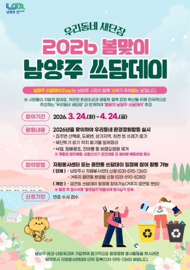 (비전21뉴스) 남양주시는 3월 24일부터 4월 24일까지 시 전역에서‘우리동네 새단장 봄맞이 남양주 쓰담데이’집중 추진기간을 운영한다고 밝혔다.