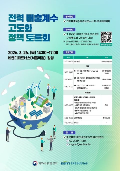 기후에너지환경부와 한국환경산업기술원은 3월 26일 오후 비앤디파트너스(서울 용산구 소재)에서 관계 전문가와 산업계가 참여하는 ‘전력 배출계수 고도화를 위한 정책토론회’를 개최한다고 밝혔다.