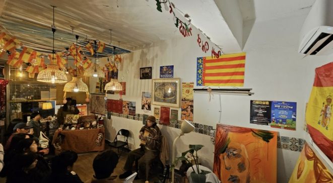 골목에 위치한 작은 가게에는 스페인 국기 가랜드와 FC바르셀로나 팀기, 각종 모임과 공연 포스터, 감각적인 유화작품들이 여기저기 걸려있다. 제멋대로인 듯 일종의 규칙과 문화를 품고 있는 공간을 보고 있노라면 주인장의 정체가 궁금해진다.