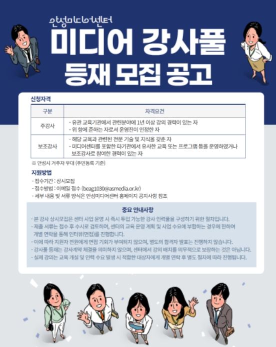 영상, 사진, 라디오, AI 기반 뉴미디어, 미디어 리터러시 등 미디어 전 분야를 대상으로 하며, 주강사와 보조강사로 구분하여 모집한다. 주강사는 해당 분야에서 1년 이상의 증빙 가능한 강의 경력을 갖추어야 하며, 보조강사 역시 관련 전문 지식 또는 유사 프로그램 운영 경험을 증빙할 수 있어야 한다. 특히 안성시에 거주하는 미디어 전문가는 선발 시 우대하여 지역 인재 발굴 및 일자리 창출에도 기여할 것으로 기대된다.