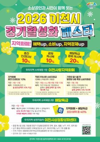 (비전21뉴스) 이천시는 침체된 지역경제에 활력을 불어넣기 위해 2026년 4월 3일부터 ‘2026 이천시 경기 활성화 페스타’를 본격 추진한다고 밝혔다.