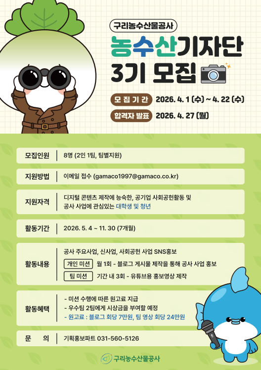 (비전21뉴스=정서영 기자) 구리농수산물공사(사장 김진수, 이하 공사)가 지역사회 물가 안정화를 위한 공사의 역할과 사회공헌활동을 국민의 눈높이에 맞춰 전달하기 위해 청년과 대학생을 대상으로 한 ‘제3기 농수산기자단’을 모집한다고 밝혔다.