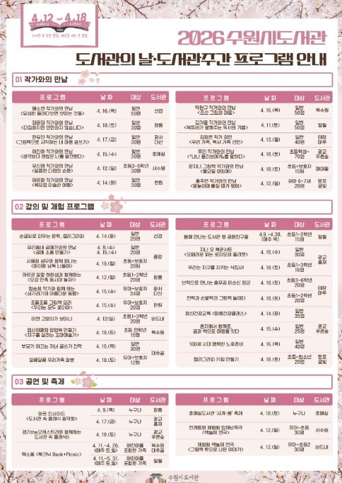 (비전21뉴스) 수원시도서관이 제62회 도서관주간(4월 12~18일)을 맞아 ‘도서관 속 작은 펼침, 세상을 여는 큰 열림’을 주제로 다양한 독서문화 프로그램을 운영한다.