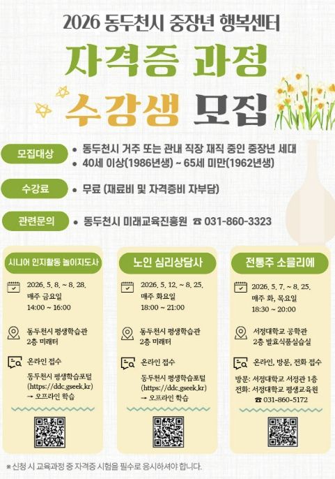 (비전21뉴스) 동두천시 미래교육진흥원은 지역 내 중장년층의 성공적인 인생 2막과 안정적인 사회 참여를 지원하기 위해 ‘2026년 중장년 행복센터 자격증 과정’ 수강생을 모집한다고 밝혔다.