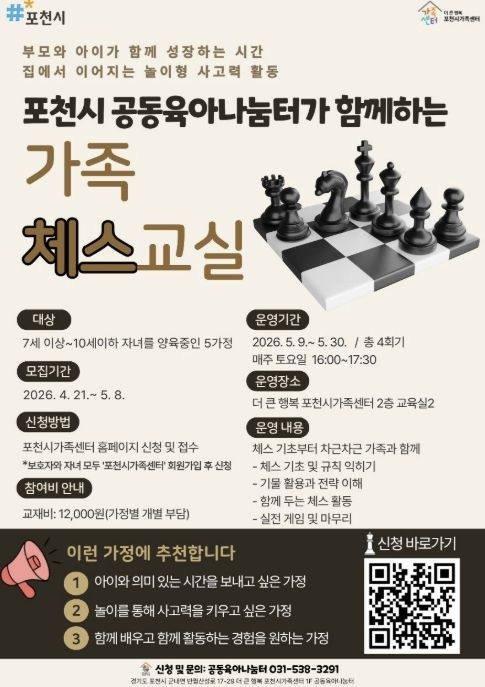 (비전21뉴스) 포천시 더 큰 행복 포천시가족센터는 공동육아나눔터 상시 프로그램의 일환으로 아동의 논리적 사고력 향상과 부모-자녀 간 긍정적 상호작용을 지원하기 위해 가족 참여형 체스 프로그램 '가족 체스 교실'을 운영한다고 밝혔다.