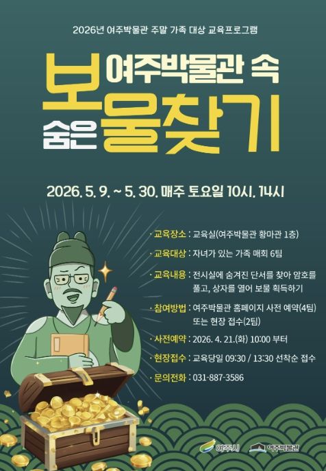 (비전21뉴스) 여주시 여주박물관은 가정의 달 5월을 맞아 가족이 함께 지역 문화유산의 가치를 즐겁게 배우고 체험할 수 있는 ‘여주박물관 속 숨은 보물찾기’를 운영한다.