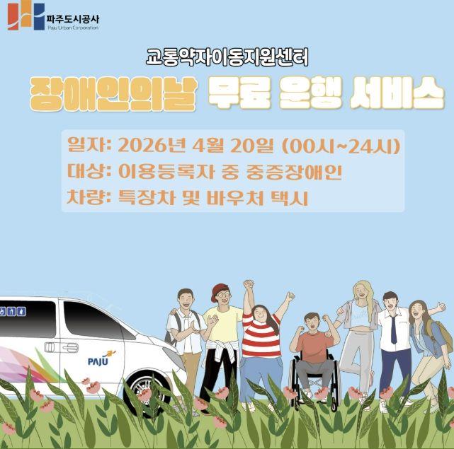 (비전21뉴스) 파주도시공사 교통약자이동지원센터에서는 오는 4월 20일 장애인의 날을 맞아 교통약자를 위한 무료 운행 서비스를 실시한다.