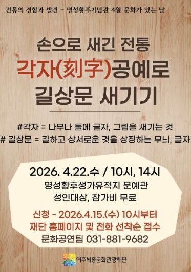 (비전21뉴스) 여주세종문화관광재단은 오는 4월 22일, 명성황후기념관 4월 문화가 있는 날 프로그램으로 '손으로 새긴 전통, 각자(刻字)공예로 길상문 새기기'를 진행한다.