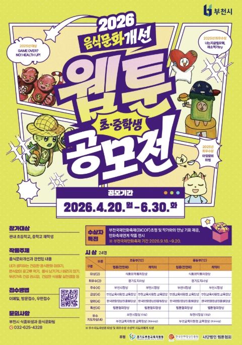 (비전21뉴스) 부천시는 4월 20일부터 6월 30일까지 ‘2026년 음식문화개선 초중학생 웹툰·캐릭터 공모전’을 연다. 이번 공모전은 학생들이 일상 속 음식문화를 주제로 직접 창작에 참여함으로써 올바른 식문화에 대한 인식을 높이기 위해 매년 추진되고 있다.