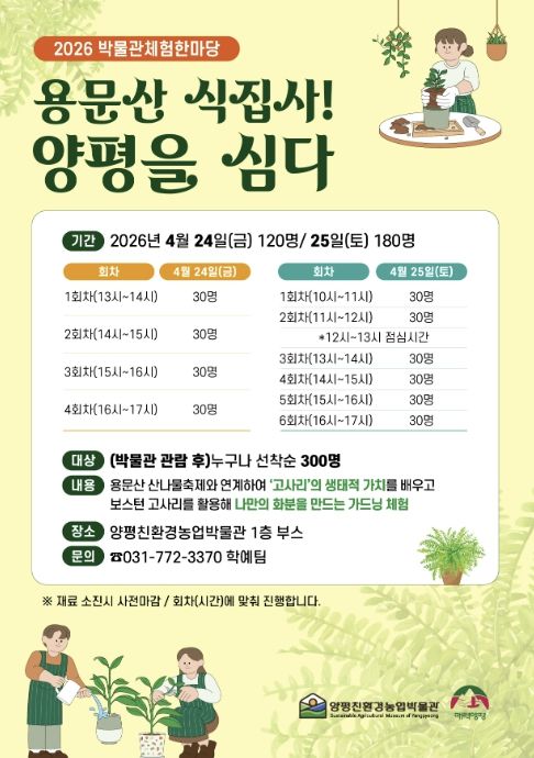 체험은 4월 24일 오후 1시부터 5시까지 4회, 4월 25일 오전 10시부터 오후 5시까지 6회로 나눠 운영되며, 관람객은 박물관 관람 후 참여할 수 있다. 모집 인원은 총 300명으로 회차별 선착순 접수로 진행되며, 장소는 양평친환경농업박물관 1층이다.