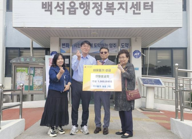 (비전21뉴스) 양주시 백석읍은 지난 17일 생명샘교회가 지역 내 어려운 이웃을 돕기 위한 성금 100만 원을 기탁했다고 밝혔다.