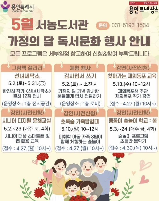 (비전21뉴스) 용인특례시 서농도서관은 오는 5월 가정의 달을 맞아 다양한 세대를 아우르는 프로그램으로 이뤄진 ‘2026년 5월 독서문화행사’를 마련했다고 21일 밝혔다.